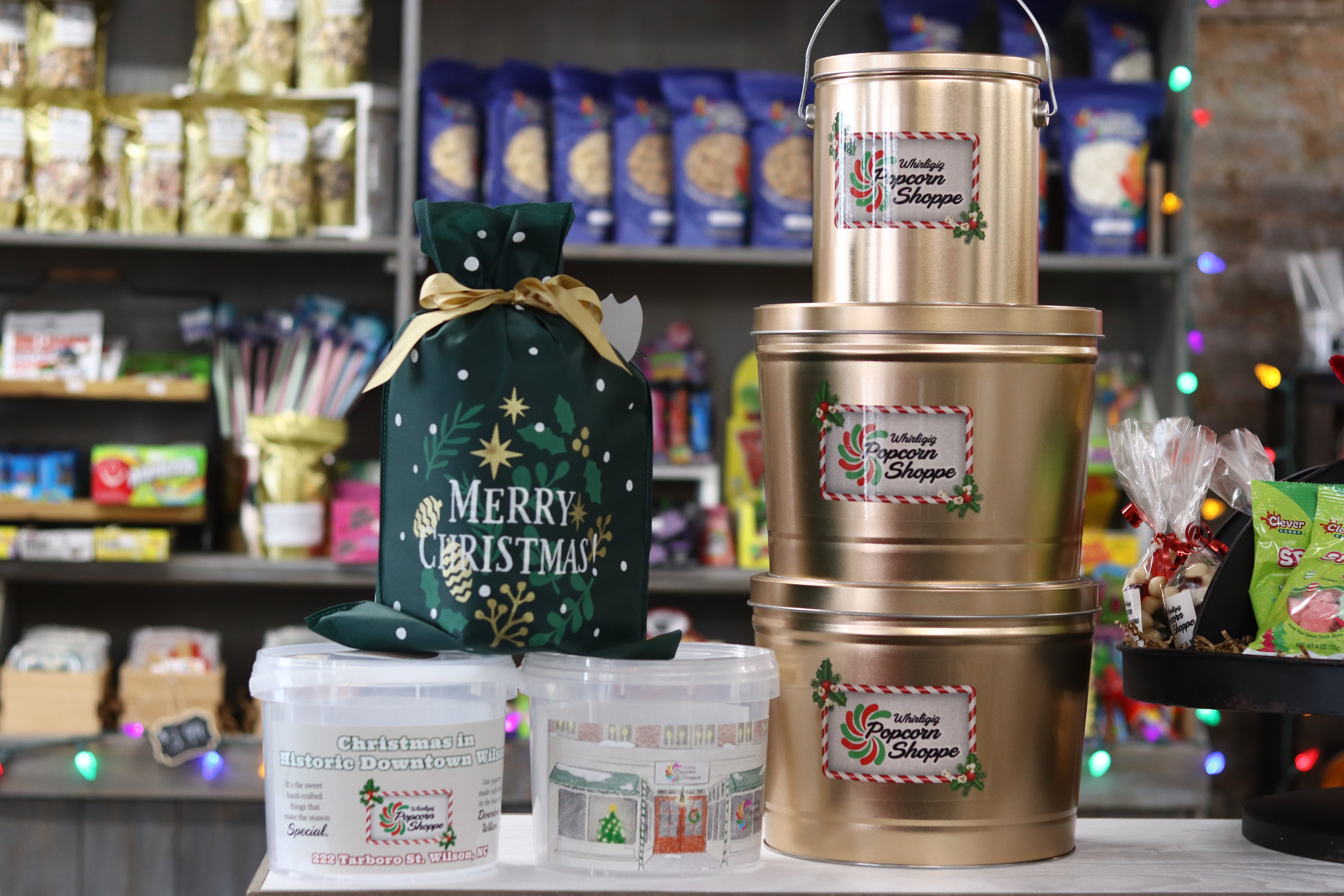 Looking for the perfect Christmas gift? Our gourmet popcorn hits the spot! Customize a festive tin or our new Historic Downtown Wilson bucket with any flavors you choose. Or pick up a Santa Sack complete with 2 large bags, 1 small bag, and our famous Christmas Trail Mix. Great for everyone on your list, plus corporate gift options available!